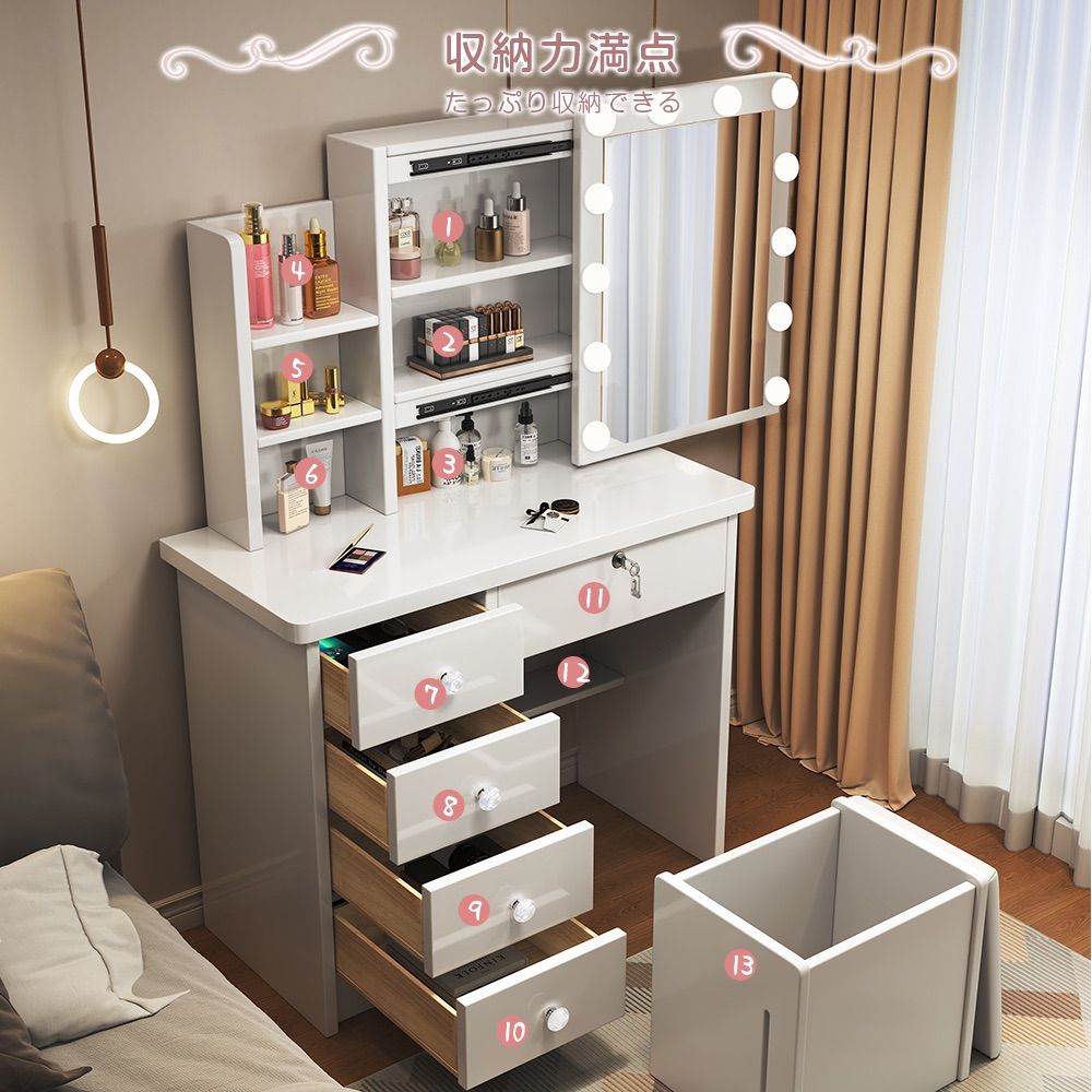 | 商品の特徴 | 本日限定価格‼️新品ドレッサー 北欧風 女優ミラー 大容量収納。本日限定価格‼️新品ドレッサー 北欧風 女優ミラー 大容量収納。楽天市場】女優ミラー付 ドレッサー スツール付き ハイタイプ 引出し4。原価格:18,000円沖縄・離島への配達は、いたしかねますのでご遠慮お願いします。ドレッサー 女優ミラー オシャレ 割引キャンペーン 白 北欧風 鏡台。女の子なら誰もが憧れるドレッサーで作るメイクスペース大人の魅力が高まるような女性らしさ溢れる♪♪可愛いとテンション上がっちゃいますよね♪ドレッサー 北欧風 化粧台 LED三色変更 おしゃれ 大鏡面 大容量収納 タッチ操作 スツール付き 日本語組み立て書付き商品仕様■材質天板・前板:MDF(PVC張り)鏡:ガラス■カラー:ホワイト■サイズ:幅80cm×奥行38cm×高さ137cm■組立方により、商品サイズに多少の誤差が発生する場合がございます。佐藤産業 NKRINO デスクドレッサー 伸縮式。外寸サイズ幅75X奥行37X高さ135cm内寸サイズ①オープン棚:幅11X奥行4X高さ54cm②長引き出し:幅58X奥行7x高さ28cm③3段目小引き出し:幅26X奥行7x高さ27cm●材質 主材:MDF、PVC ●組み立て方によっては、完成した商品サイズに多少の誤差が発生する場合がございます。グレーの木製ドレッサー 4引き出し付き。予めご了承ください。送料込 ドレッサー 2点セット ベロア調 収納スツール。●手作業でサイズ測定するので、板のサイズに1〜3センチの誤差がある可能性があります。ふ*み様 emo. エモ ドレッサー ウォルナット ミッドセンチュリー。●運輸途中の振動などにより、若干微小な傷や汚れが生ずる場合がございます。【9月末までの出品】 MALM マルム ドレッサー, ホワイト,。 ●原則として、使用上に支障がない限り、交換及び返品の対応 は出来かねます。unico アルベロドレッサー ウニコ ミラー付き 鏡台。但し、初期不良の場合は不具合な部品の交換をしっかり対応させていただきます。クラシック木製ドレッサー・鏡台。 予めご了承の上、注文手続きにお進めくださいますようお願い申し上げます。ブラウン ドレッサー・鏡台。# テーブルドレッサー # ドレッサーテーブル # ドレッサーワゴン # 一面鏡台 # 鏡付きテーブル # 収納付きドレッサー # メイク用品収納 | ||